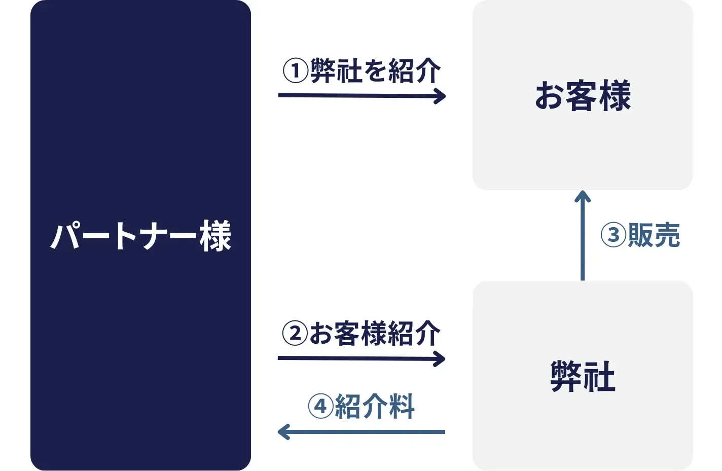 - 弊社サービスをご提案し、成約いただきましたら、手数料をお支払いする制度です。パートナー様が直接お客様と契約、サービス提供を行なっていただきます。